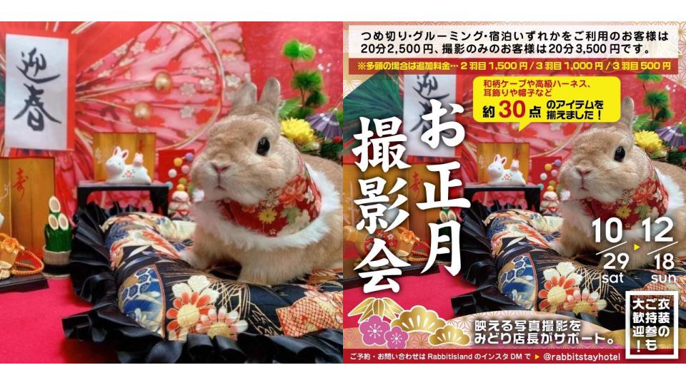 【受付中】お正月バージョンのフォトサービス開催中 投稿者:Rabbit Island2022年10月28日2022年11月5日カテゴリー:お知らせ Grece lilyさんとラビットアイランドコラボ企画! 来年は待望のうさぎ年 『お正月写真撮影会』がスタート! 30アイテムを越える可愛い和柄のお衣裳など自由自在に着れます。お持込みお衣装も大歓迎です。新年のご挨拶年賀状はこれで決まりですね 【予約方法】完全予約制にて、その他のサービスよりお申し込み下さい。 ☆お爪切りやグルーミング&ホテルと併用予約すると、よりお得価格になります価格の詳細は告知ポスターをご覧ください いいね 読み込み中… 関連